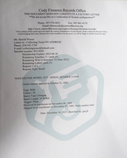 Winchester Model 1873 Lever-Action Rifle; Serial No. 315946; Per Cody Firearms Records: .38 Caliber Rifle with 28 inch Octagon Barrel and Plain Trigger; Shipped November 06, 1889 (Order# 4447); Note: 2 inch Longer Barrel than Standard; 100% Pure Untouched, Unaltered, 137 Year-Old Winchester Rifle; Montana History; Bought by Paul Lankford in 2001 (See Photos); Perfect Action; Excellent Strong Bore with light chattering; Crisp unaltered Patina Finish with Great Original Wood; 100% Correct; See All Photos for Condition; No Texts; Call (254)541-5765 or Email Only; PERSONAL PROPERTY of Harold Wieser; NOTICE: We Do Not Do Any Consignments - All Items Listed are Owned by Us - NO SALES to New Jersey or New York City - Antiques Only to Massachusetts and California; NOTE: All Modern Firearms Must Go to FFL Dealer who will Accept From Individual with Texas Driver License; Price: $3,475 + $50 S&H; Payment Address: Harold Wieser - 1466 U.S. Hwy 77 - Rosebud, TX 76570; SEND PAYMENTS VIA USPS PRIORITY MAIL; BEWARE of SCAMS!!! - DO NOT SEND MONEY or CORRESPONDENTS ELECTRONICALLY UNLESS YOU HAVE SPOKEN to HAROLD WIESER FIRST! (254)541-5765