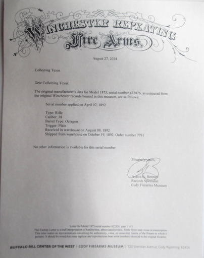 Winchester Model 1873 Rifle; Serial No. 422826B; .38 W.C.F. Caliber; Made 1892; 24 inch Octagon Barrel; Letter on Order; Lots of Original Metal Finish Present; Great Wood Stocks; Perfect Action and Bore; Really Nice 133 Year-Old Winchester Model 1873 Rifle; See All Photos for Condition; No Texts; Call (254)541-5765 or Email Only; PERSONAL PROPERTY of Harold Wieser; NOTICE: We Do Not Do Any Consignments - All Items Listed are Owned by Us - NO SALES to New Jersey or New York City - Antiques Only to Massachusetts and California; NOTE: All Modern Firearms Must Go to FFL Dealer who will Accept From Individual with Texas Driver License; Price: $7,475 + $75 S&H Via USPS Priority Mail; Payment Address: Harold Wieser - 1466 U.S. Hwy 77 - Rosebud, TX 76570; SEND PAYMENTS VIA USPS PRIORITY MAIL; BEWARE of SCAMS!!! - DO NOT SEND MONEY or CORRESPONDENTS ELECTRONICALLY UNLESS YOU HAVE SPOKEN to HAROLD WIESER FIRST! (254)541-5765