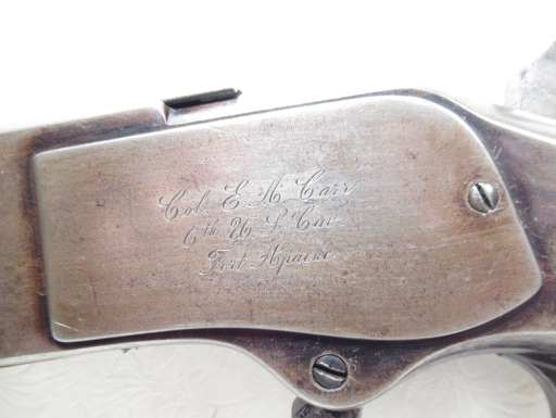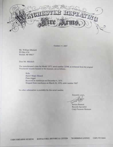 Winchester Model 1873 Lever Action Rifle; Serial No. 12540; Per Included Factory Letter: Rifle with Round Barrel and Plain Trigger; Shipped March 24, 1876 Order No. 5667; Receiver Inscribed 'Col. E.A. Carr 6th U.S. Cav. Fort Apache'; Many Documents and Books Included; Very Rare and Historic 1873 Winchester Rifle; See All Photos for Condition; No Texts; Call (254)541-5765 or Email Only; PERSONAL PROPERTY of Harold Wieser; NOTICE: We Do Not Do Any Consignments - All Items Listed are Owned by Us - NO SALES to New Jersey or New York City - Antiques Only to Massachusetts and California; NOTE: All Modern Firearms Must Go to FFL Dealer who will Accept From Individual with Texas Driver License; Price: $27,500 + $75 S&H; Payment Address: Harold Wieser - 1466 U.S. Hwy 77 - Rosebud, TX 76570; SEND PAYMENTS VIA USPS PRIORITY MAIL; BEWARE of SCAMS!!! - DO NOT SEND MONEY or CORRESPONDENTS ELECTRONICALLY UNLESS YOU HAVE SPOKEN to HAROLD WIESER FIRST! (254)541-5765